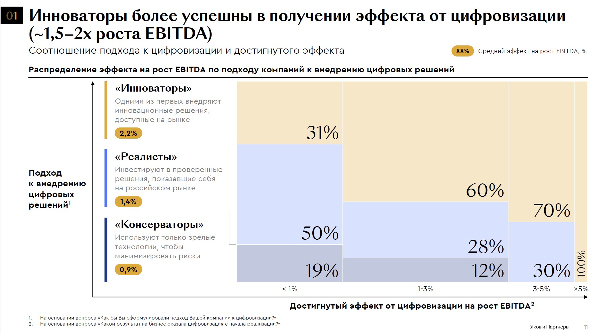 «Активность в инновациях напрямую связана с финансовыми результатами. Чем выше готовность компании экспериментировать и внедрять новые технологии, тем выше ее прибыль. Разрыв между инноваторами и консерваторами превышает двукратный уровень — 2,2% против 0,9%», — подчеркнул руководитель проектов «Яков и Партнёры» Всеволод Кузнецов.