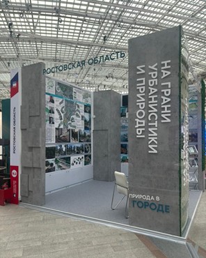 в рамках смотра-конкурса «Регионы России» в разделе «Реализация», в номинации «Развитие территорий и градостроительные решения». Концепция экспозиции построена на контрасте фактур и материалов: асимметричная композиция стенда в форме куба и многоуровневая компоновка планшетов символизируют динамичное развитие Ростовской области, где современные индустриальные решения органично сочетаются с природным разнообразием.